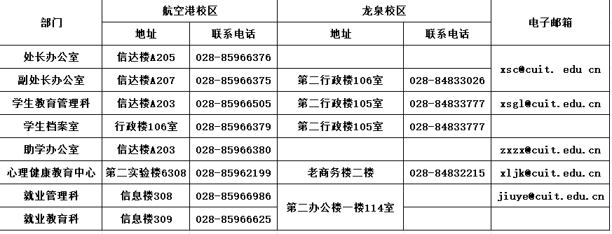 学生工作处作为学校主要行政职能部门,负责全校学生的思想政治教育管理、学生事务管理、学生资助、就业指导、心理健康教育、第二课堂运行管理、辅导员队伍建设等工作。设学生教育管理科、助学办公室、心理健康教育中心、就业教育科、就业管理科5个科室。
