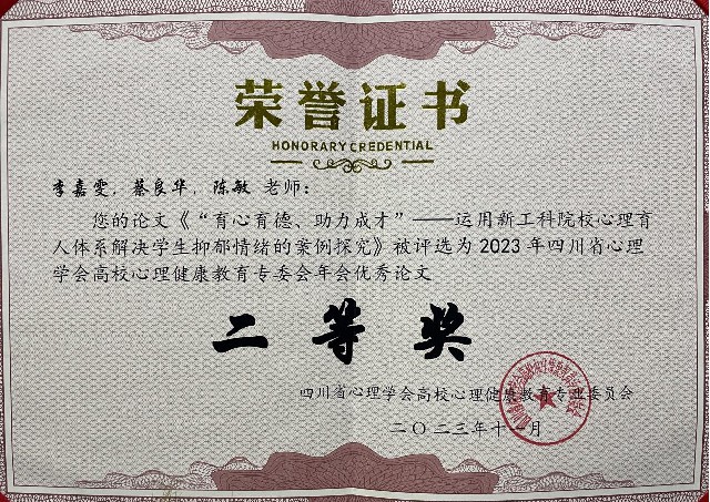 我校教师论文荣获2023年四川省心理学会高校心理健康教育专委会年会优秀论文二等奖,为心理育人科研工作本土化、常态化的工作机制提供了良好基础。