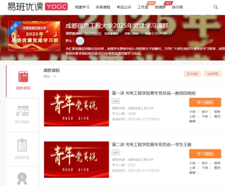 本次活动由教育部易班发展中心主办,依托易班优课平台开展,旨在推动高校党建学习资源共建共享,加强学生入党积极分子的培养教育,深化党史学习教育成效。线上优课群学习开展围绕“青年党员说”、“讲四史”两大系列,汇聚各学院优秀师生代表的精彩分享,让同学们在历史的回顾中汲取精神养分、用理论提升思想境界、强化作为青年一代的责任担当,是全校师生在党史学习教育与易班平台融合实践中,凝心聚力、协同奋进的生动缩影。