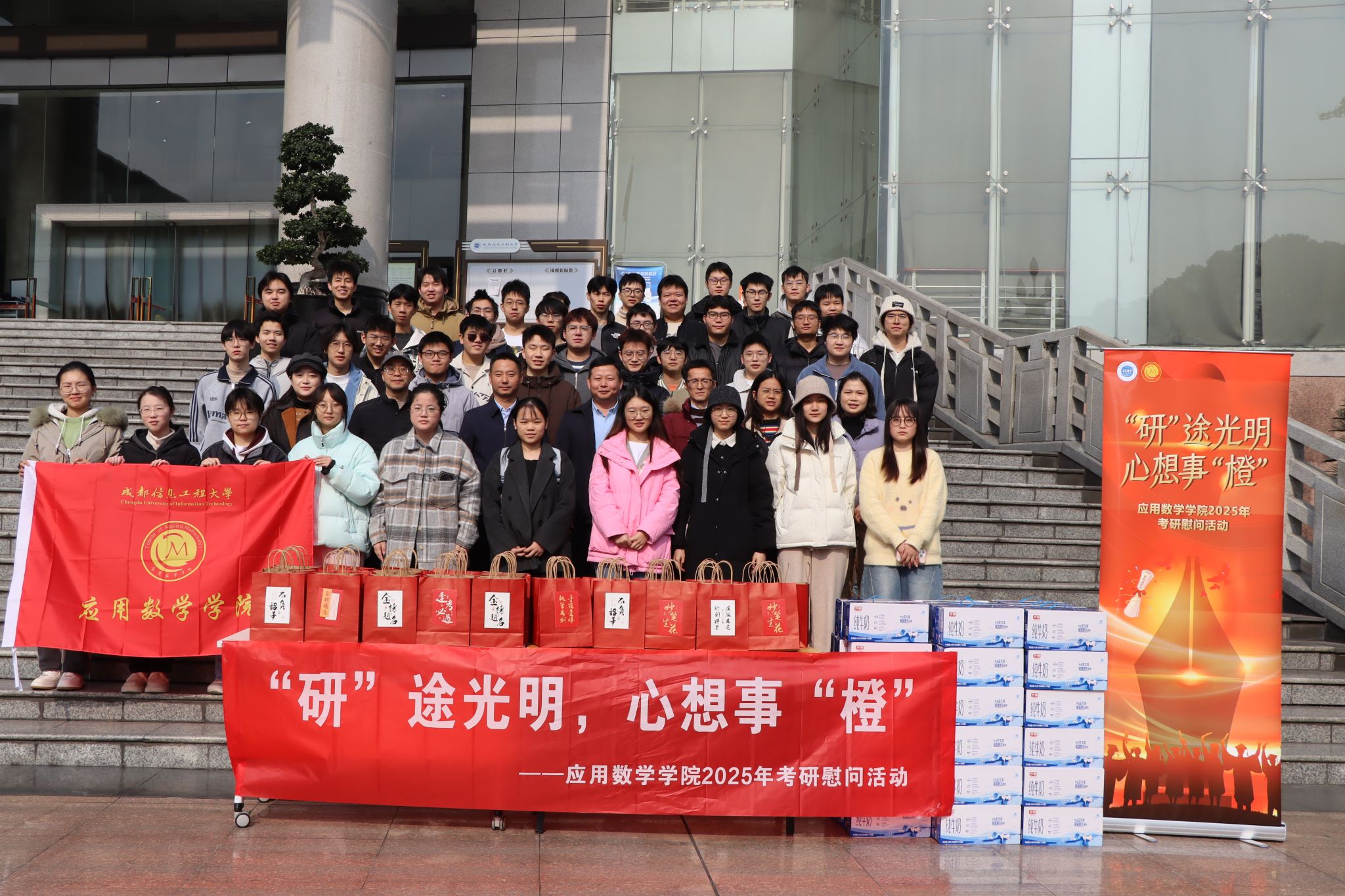 12月5日,应用数学学院在航空港校区图书馆门口开展“‘研’途光明,心想事‘橙’”2025年考研慰问活动,为备战考研的学子送上暖心祝福与慰问物资。学校党委常委、副校长陈权亮,学院党委书记林细俤、院长周钰谦、党委副书记朱正华及全体辅导员参加活动。