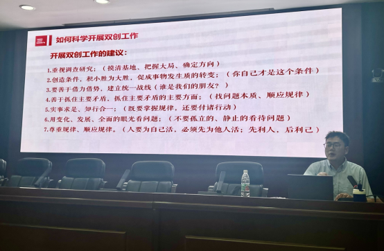 如何科学开展双创工作,厉威成谈到广大辅导员要想开悟;读历史、读党史、读《毛选》,有了思想武器,有了认知提高,不管是搞双创还是搞思政,都能得心应手,都能讲通讲透。随着中国的发展,我们要深刻认识中国式现代化,充分领悟“一带一路”国家战略,准确把握未来创新创业的方向,注重与新一代信息技术、新能源、新材料、先进制造、生物技术等战略性新兴产业,人工智能、量子信息、脑机接口、卫星互联网、人形机器人等未来产业创新结合。