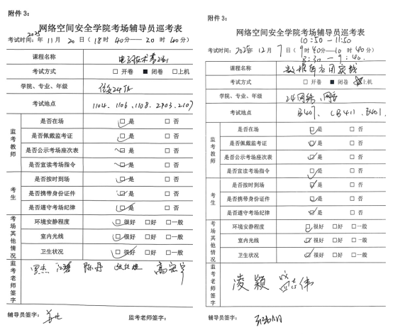 三是“强化巡查,严肃考风”考试期间全程巡考。在期末考试期间,学院安排辅导员深入各考场进行巡考。巡考工作旨在协助监考教师维护考场秩序,预防和及时处理可能的违纪苗头,确保考试顺利进行。通过一线巡查,进一步督促学生自觉遵守考试纪律,营造严肃认真的考试氛围。